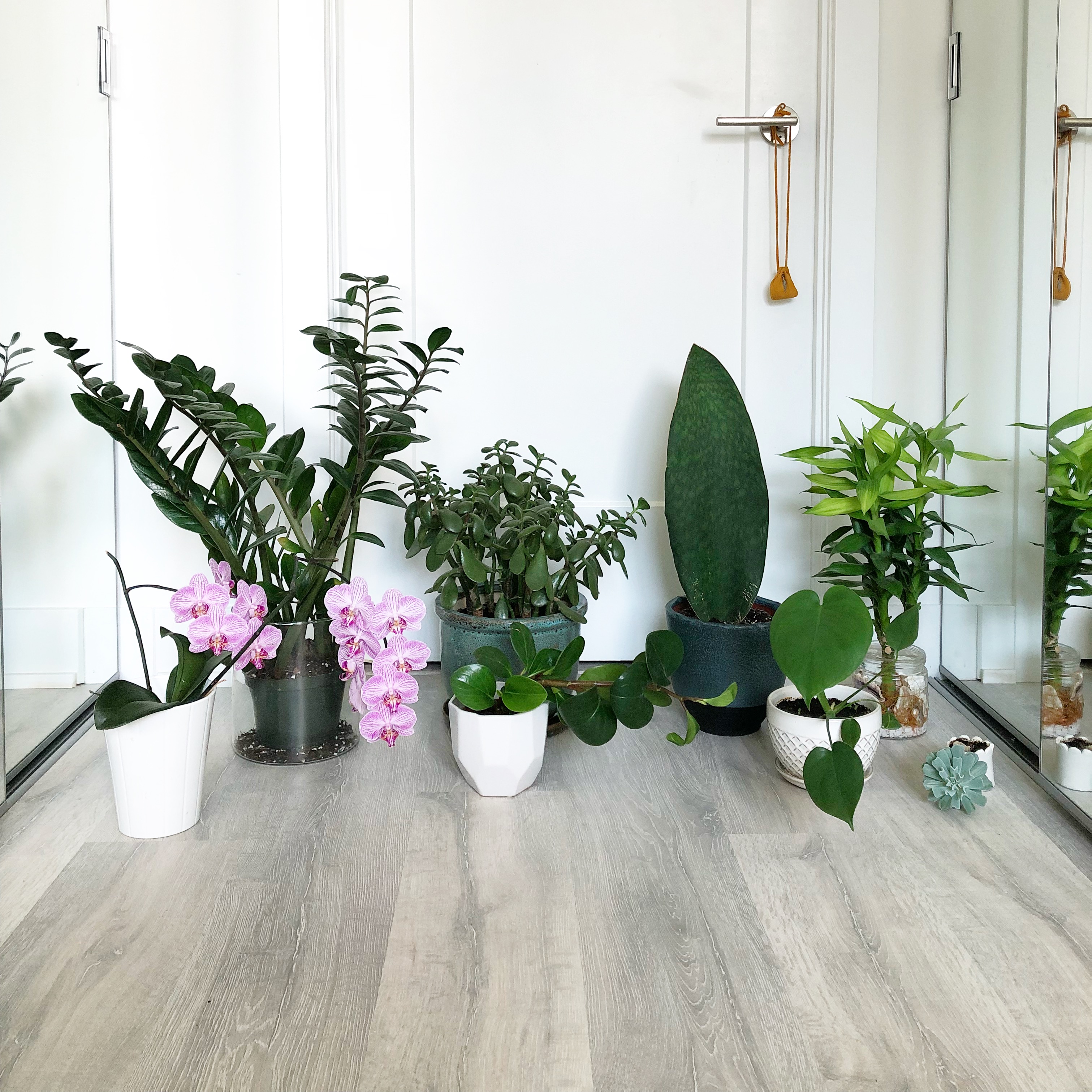 back from left to right: zamioculcas zamiifolia, crassula ovata, sansevieria masoniana, dracaena sanderiana; front from left to right: phalaenopsis orchid, peperomia obtusifolia, baby monstera deliciosa, echeveria