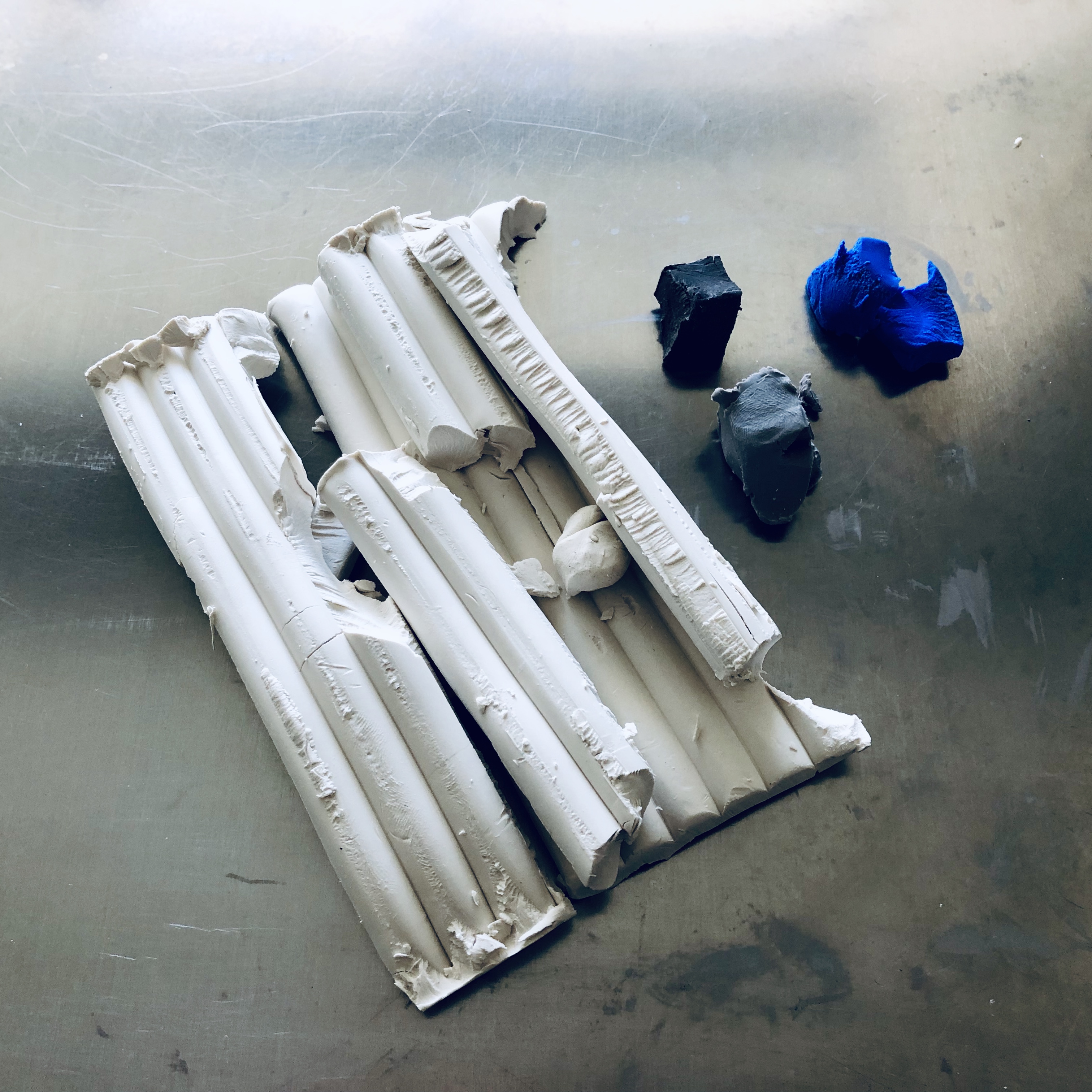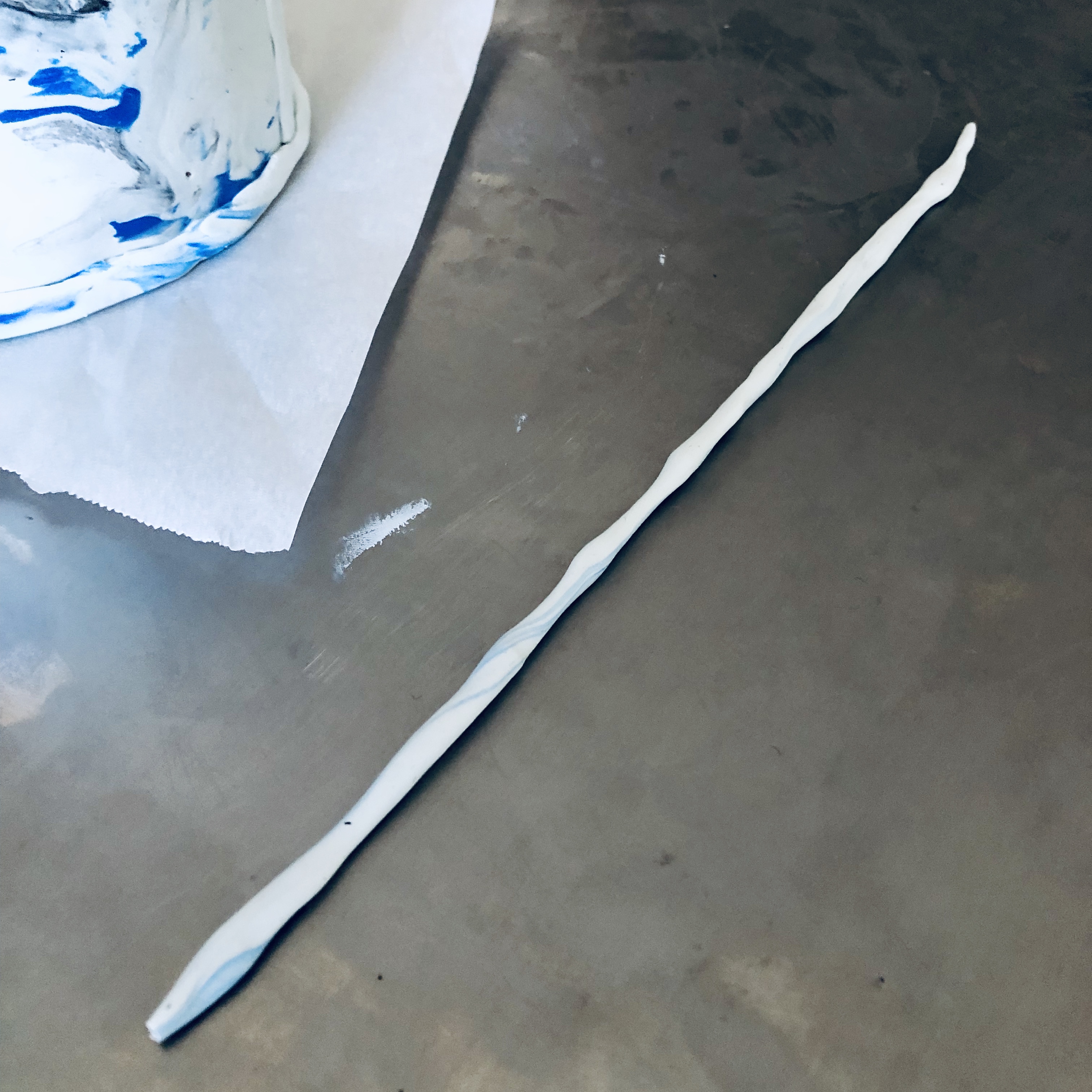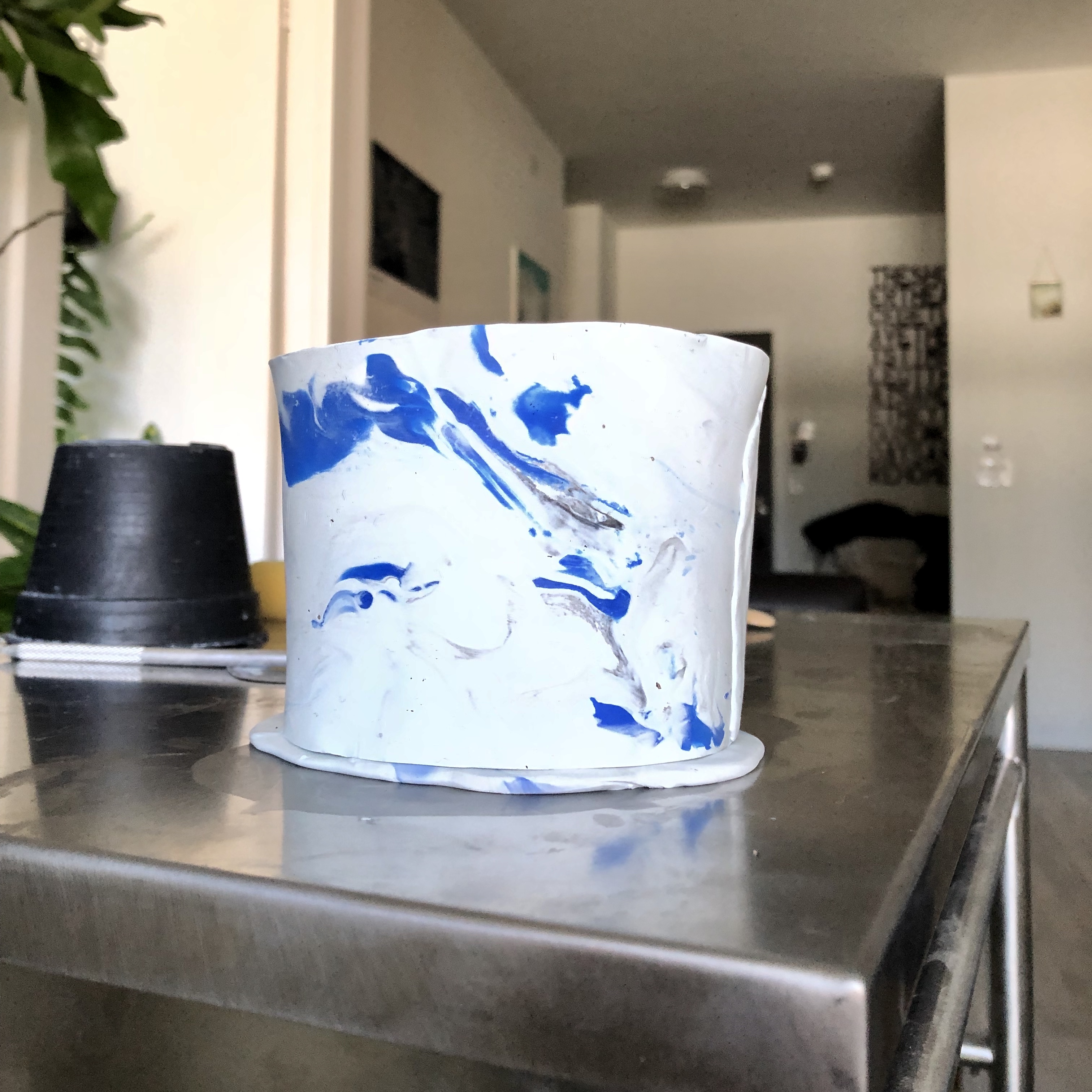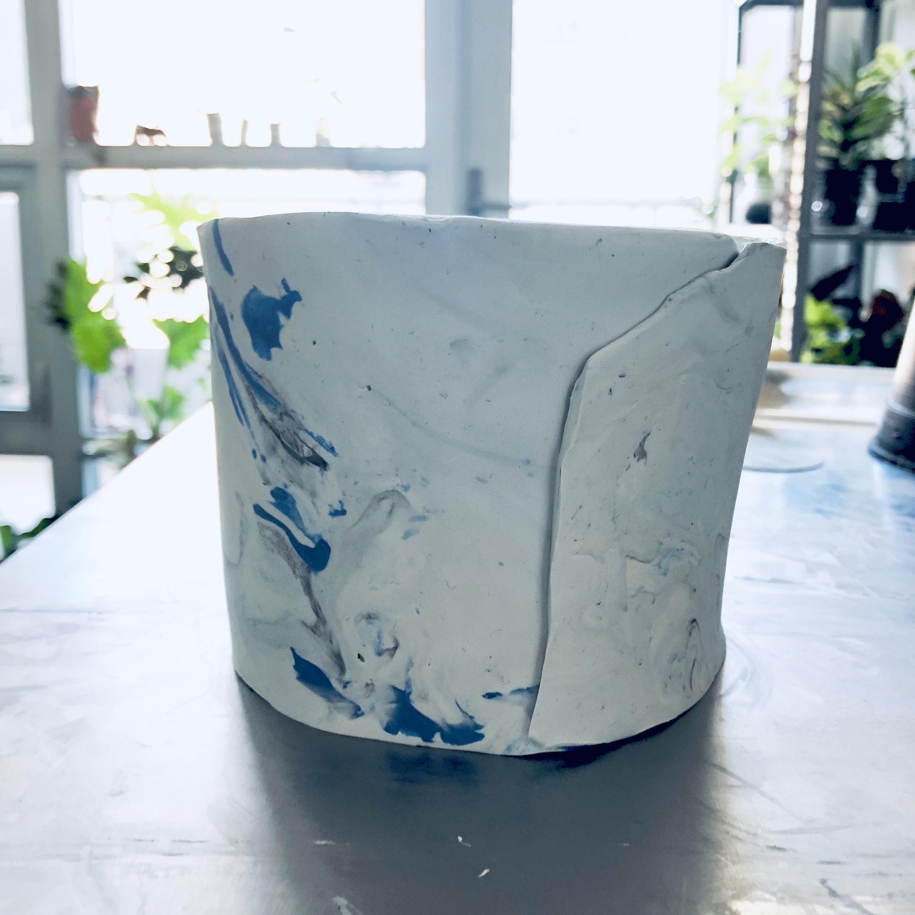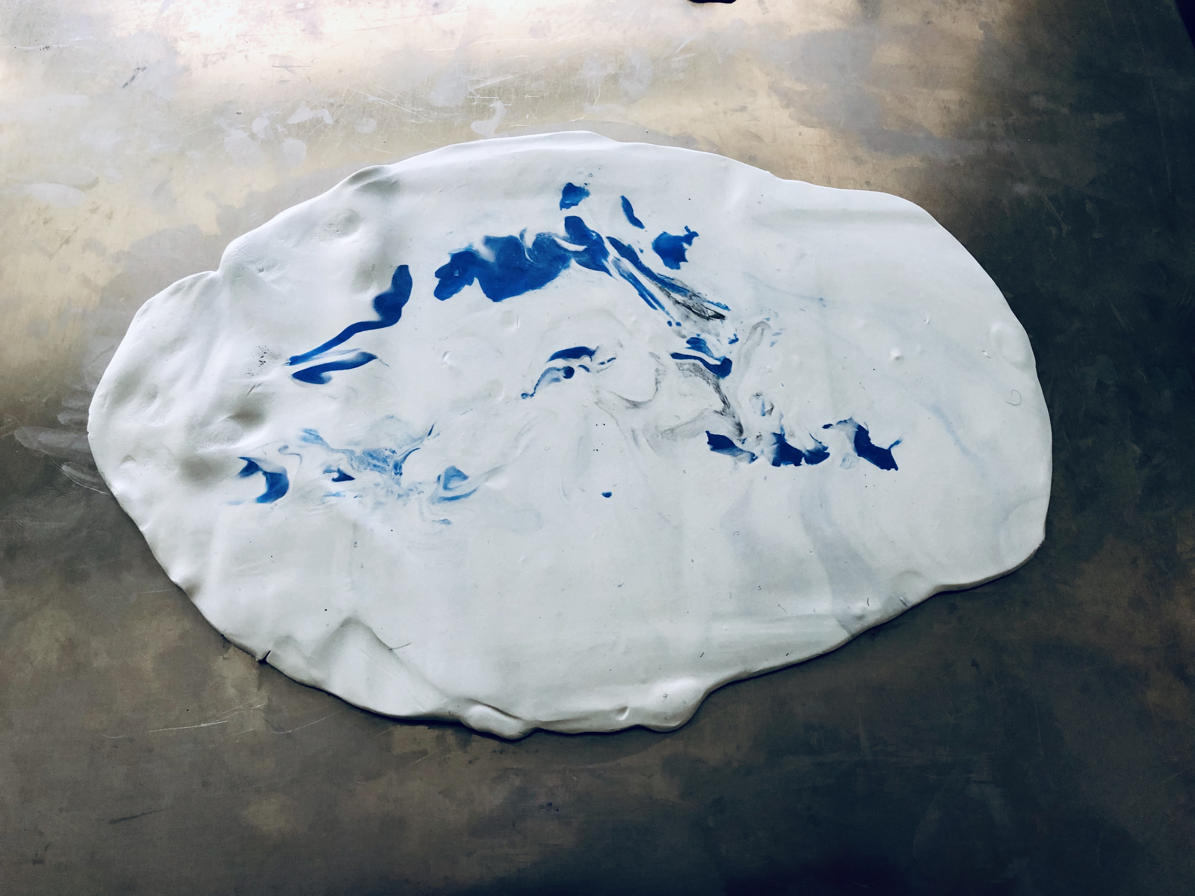 • you can also hand build the marbling by placing pieces of different colours of clay on the base and blending them into the base by hand. i did this with the blue spots.